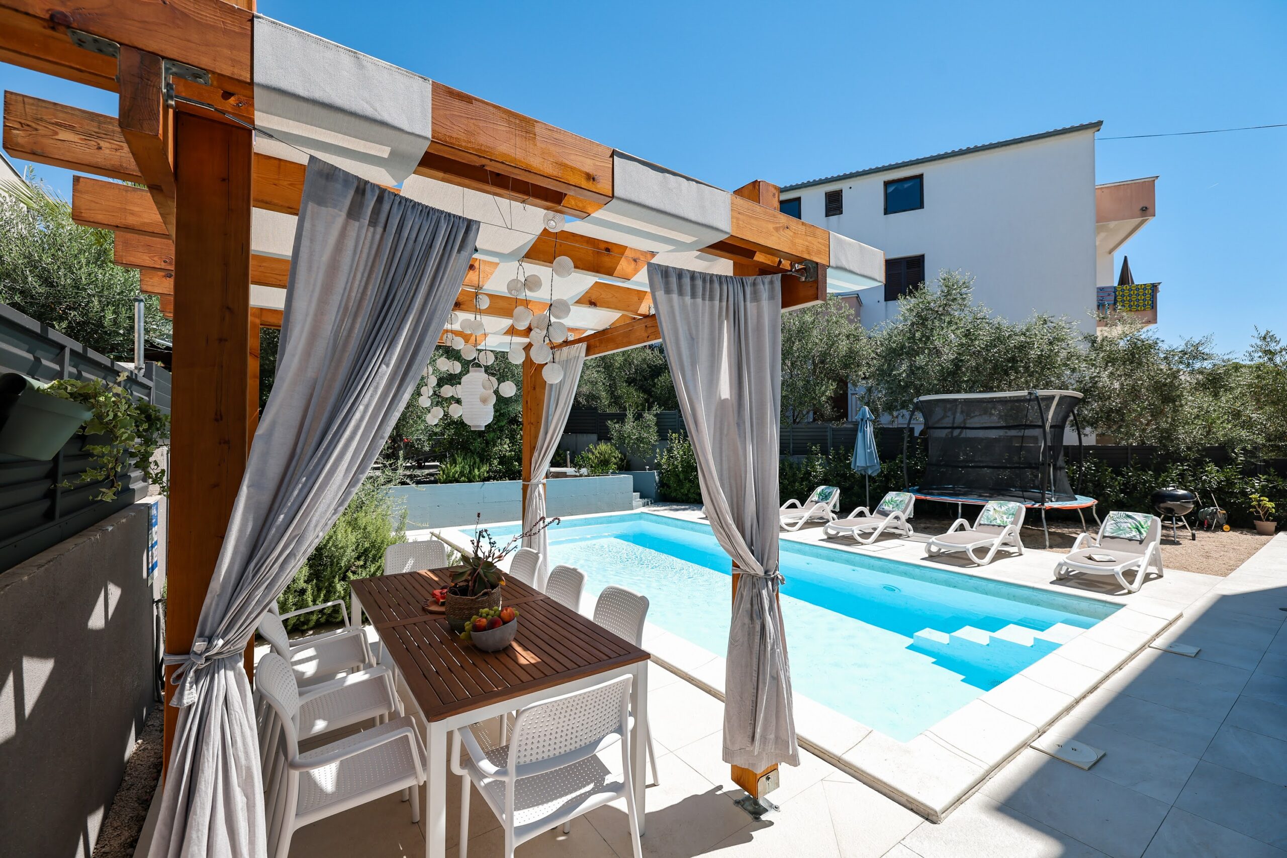 We stayed as a family of 8 including 2 young children. Here’s a list of amazing things that Villa Val has going for it. - Prompt, friendly and helpful communication with Marinko, the owner - restaurant recommendations were great - Beautiful roof terrace for sunsets - Beautiful shady and sunny pool area - you can escape the sun if you want to - Many amenities for children & adults - pool table, trampoline, ping pong, board games, inflatables etc… - Spotlessly clean & secure - Perfect location - shop & beach 5 minutes away. Zadar old town 10 mins by Uber or a little more by bus Villa Val is 5* and even more incredible in real life!